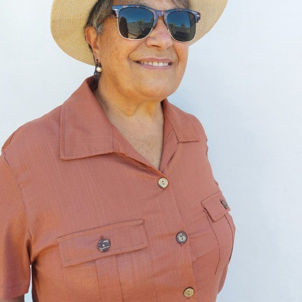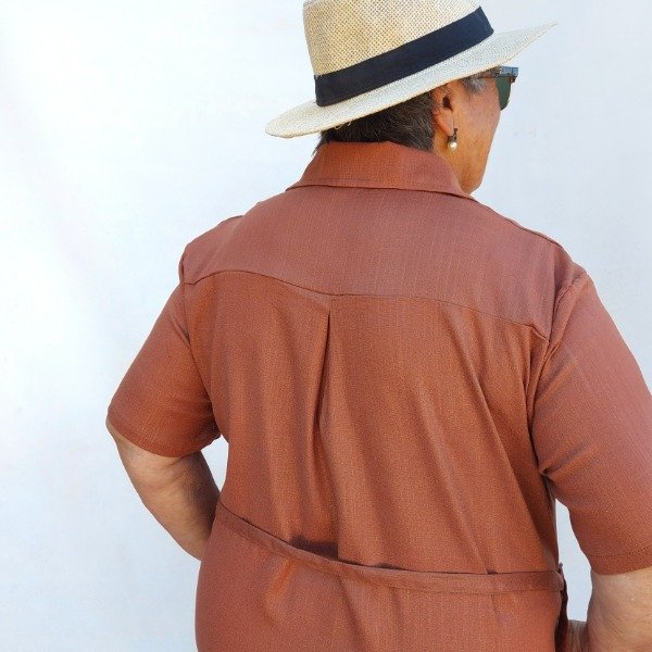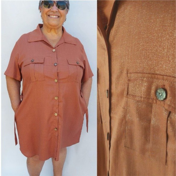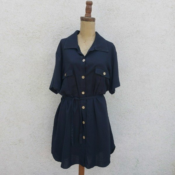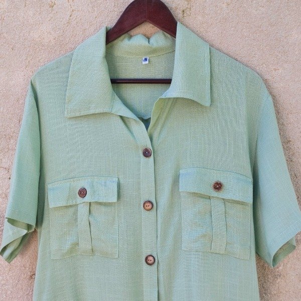 Vestido corte simple y relajado, parecido a una camisa larga. Lleva cuello, botones al frente y dos bolsillos con solapa en el pecho, además de prácticos bolsillos laterales.