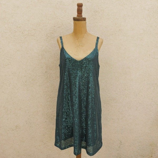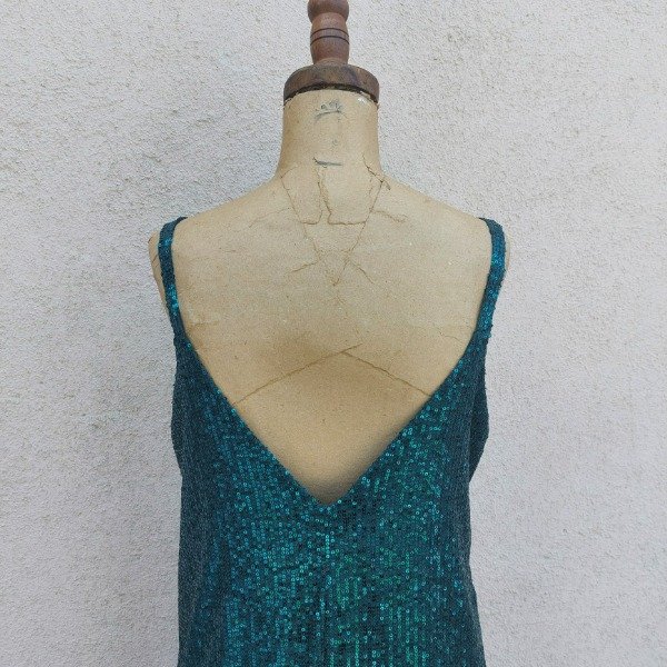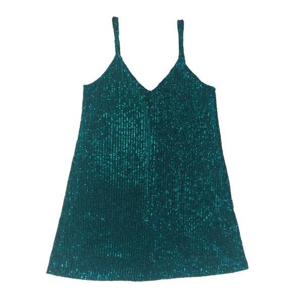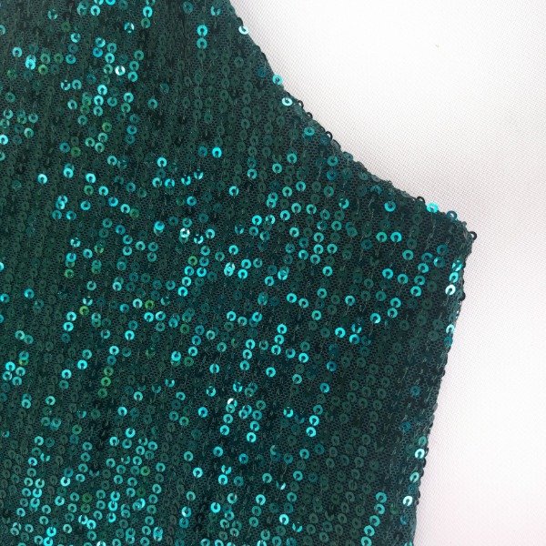 Vestido de fiesta verde, confeccionado en tela Paillete, es una tela de punto (que estira) con mini lentejuela bordadas.