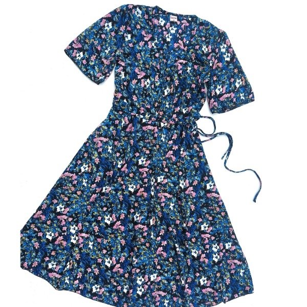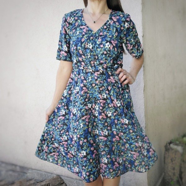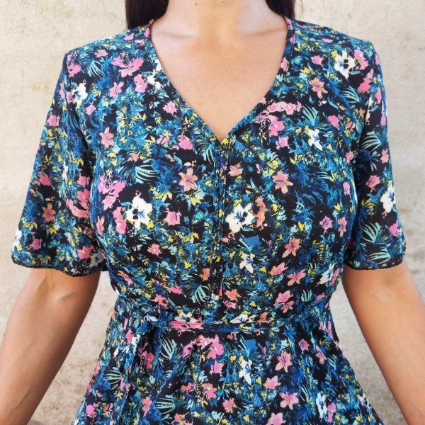 Vestido modelo evasé con escote en "V" acorazado y largo por debajo de la rodilla. Mangas amplias acampanadas, corte en la cintura y cinto separado. Esto te permite usarlo entallado o suelto.
