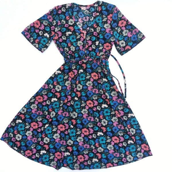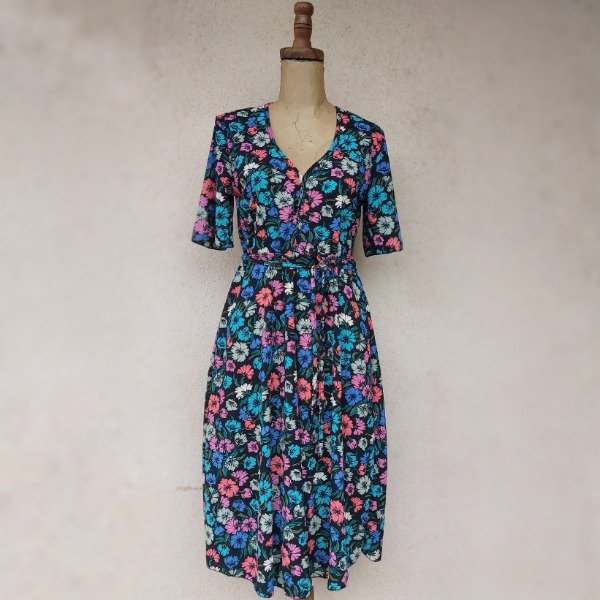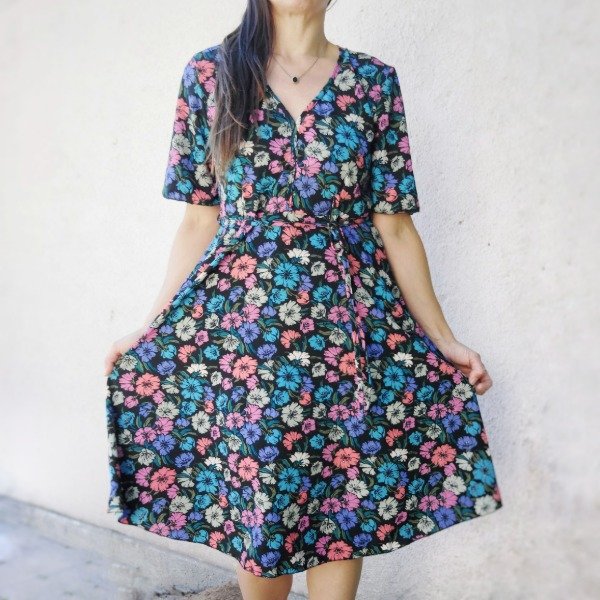 Vestido modelo evasé con escote en "V" acorazado y largo por debajo de la rodilla. Mangas amplias acampanadas, corte en la cintura y cinto separado. Esto te permite usarlo entallado o suelto.