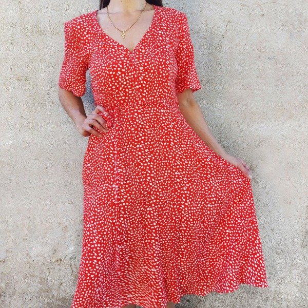 Vestido modelo evasé con escote en "V" acorazado y largo por debajo de la rodilla. Mangas amplias acampanadas, corte en la cintura y cinto separado. Esto te permite usarlo entallado o suelto.